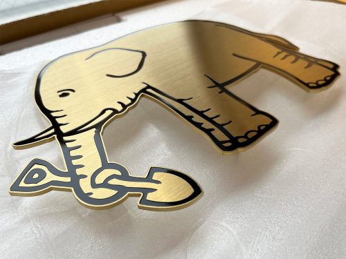 We produced an indoor sign featuring stainless steel cut letters and a logo etched onto a titanium-plated surface.