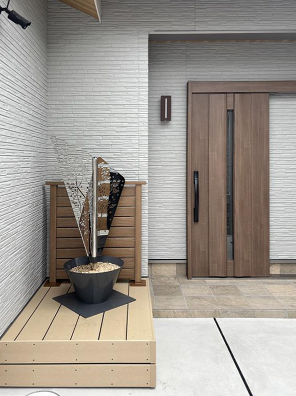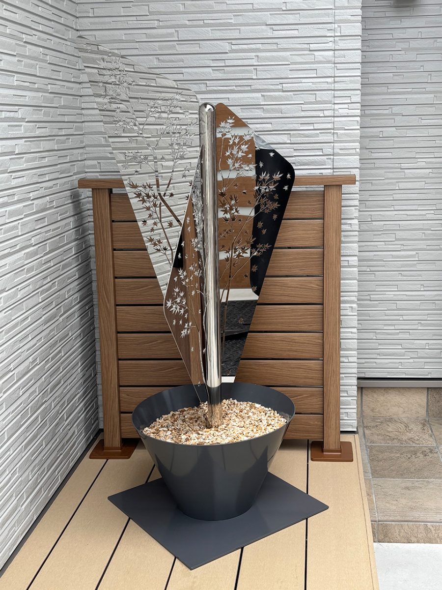 庭木の管理は水やり・剪定等日々の手入れが必要です。ステンレス樹木オブジェはメンテナンスフリーでアクセントとなる彩を創出するアイテムの一つとして設置しました。